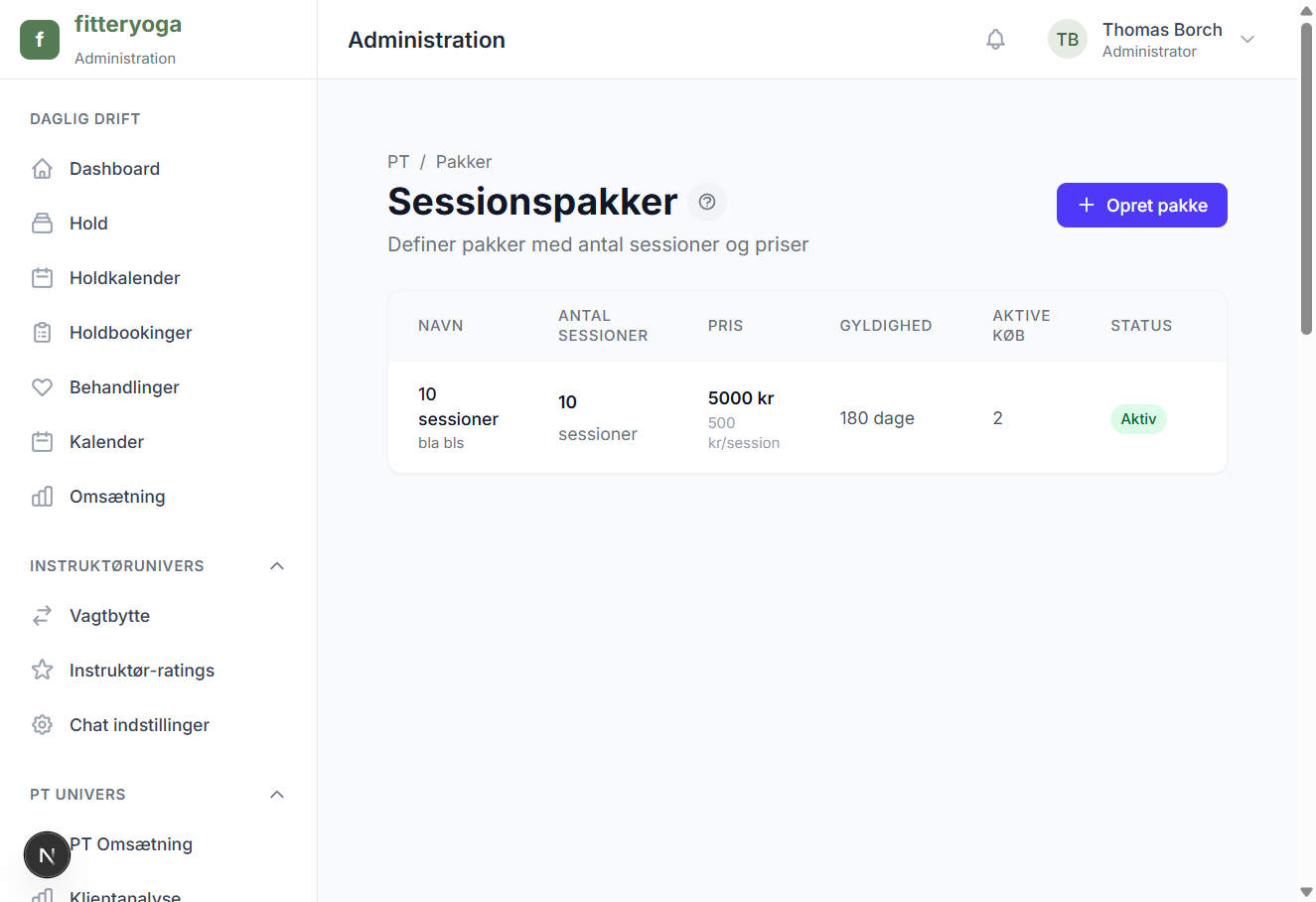 Definer pakker med antal sessioner og priser. Klienter køber online.